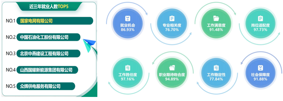 項(xiàng)目實(shí)施以來,學(xué)院工作質(zhì)效和學(xué)生職業(yè)技能顯著提升,高質(zhì)量就業(yè)問題得到解決。2022級學(xué)生持證率達(dá)92.18%,2024年在各類技能競賽中獲得國家級獎項(xiàng)10項(xiàng)、省級52項(xiàng),持證學(xué)生成為人才市場的“香餑餑”。畢業(yè)生中,24.48%入職國企,其中累計(jì)考入國網(wǎng)公司系統(tǒng)215人(含主業(yè)109人、供服96人);75.52%入職其他企業(yè),學(xué)生工作滿意度達(dá)91.48%,高質(zhì)量就業(yè)成效凸顯。