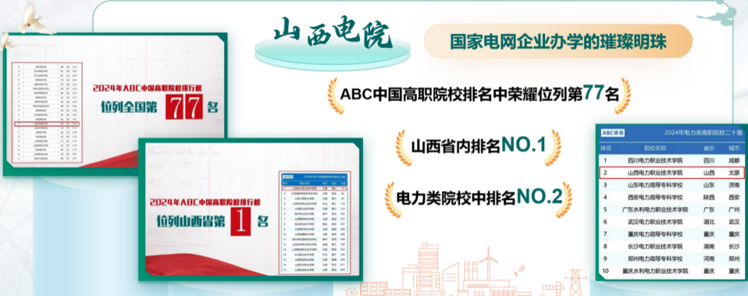 2024年ABC中國高職院校排名中,學(xué)院位列全國第77名、省內(nèi)第1名、電力類院校第2名。率先開展的“1+4”取證工作在全省51所職業(yè)院校及國網(wǎng)系統(tǒng)內(nèi)12所電力高職院校中獨(dú)樹一幟,形成可復(fù)制的高職高質(zhì)量就業(yè)“電院方案”,彰顯國網(wǎng)公司在教育領(lǐng)域積極履行社會責(zé)任、推動行業(yè)發(fā)展的擔(dān)當(dāng)與作為。