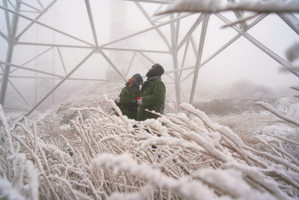 12月12日,國(guó)網(wǎng)運(yùn)城供電公司員工在110千伏金古線固定觀冰哨開展線路覆冰觀測(cè)。